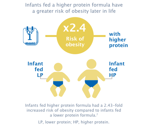 Based on the latest science, some companies have lowered the protein in infant formula and follow-on formulae in recent years. The aim is to achieve a slower growth rate in formula-fed infants, comparable to that of a breastfed infant,15 and to help reduce the infant’s risk of becoming overweight or obese later in life.5