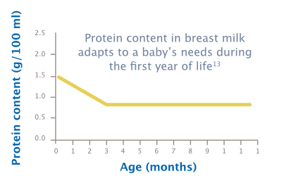 Breastfed babies tend to grow more slowly than formula-fed babies. This slower growth rate has shown significant long-term health benefits, including a lower risk of obesity and cardiovascular disease.8–12 The protein content of breast milk adapts to the infant’s requirements and decreases over the course of lactation in order to support age-appropriate growth.13,14